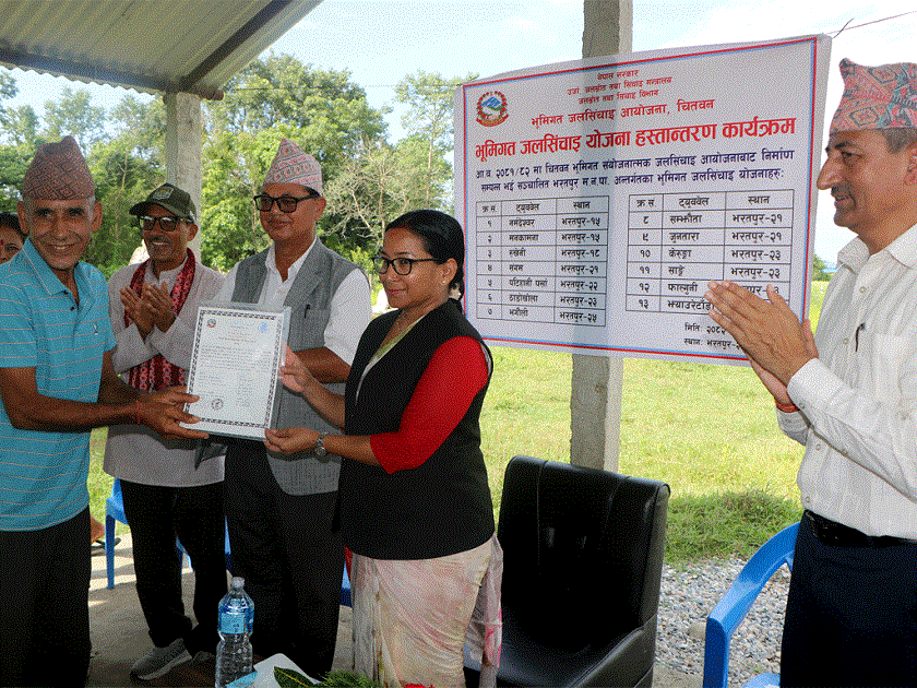 वैकल्पिक सिँचाइ अभाव भएका क्षेत्रमा सेवा पुगोस् भन्ने उद्देश्यले आयोजना निर्माण गरिएको भूमिगत जल सिँचाइ आयोजना चितवनका कार्यालय प्रमुख विश्वबन्धु केसीले बताए । उनका अनुसार हस्तान्तरण भएका आयोजना नर्मदेश्वर र मनकामना (भरतपुर–१५), रुखेनी (भरतपुर–१८), सङ्गम, सम्झौता र जुनतारा (भरतपुर–२१), पटिहानी पर्सा (भरतपुर–२२), ठाडोखोला, केरुङ, साँङ्गे र फाल्गुनी (भरतपुर–२३), भगौली (भरतपुर–२५) र झ्याउरेटाँडी (भरतपुर–२७) रहेका छन् ।