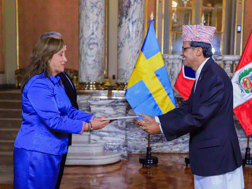 काठमाडौँ । ब्राजिलका लागि नेपालका राजदूत निर्मलराज काफ्लेले आज पेरुका राष्ट्रपति दिना एर्सिलिया बोलुआर्टे जेगारासमक्ष नेपालका गैरआवासीय राजदूतका रूपमा आफ्नो ओहोदाको प्रमाणपत्र प्रस्तुत गरेका छन् ।
