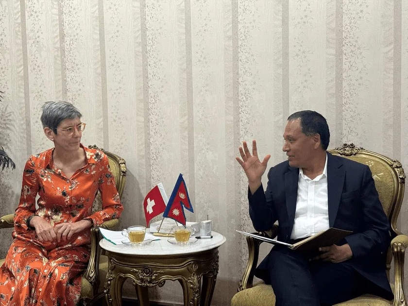 काठमाडौँ । ऊर्जा, जलस्रोत तथा सिँचाइमन्त्री कुलमान घिसिङ र नेपालका लागि स्विट्जरल्याण्डका राजदूत डेनिएल मेउलीबिच शिष्टाचार भेटवार्ता भएको छ । बिहीबार सिंहदरबारस्थित ऊर्जा, जलस्रोत तथा सिँचाइ मन्त्रालयमा भएको भेटमा मन्त्री घिसिङलाई राजदूत मेउलीले स्विट्जरल्याण्डका तर्फबाट बधाई दिनुका साथै सफल कार्यकालको शुभकामना व्यक्त गरेकी छन् ।