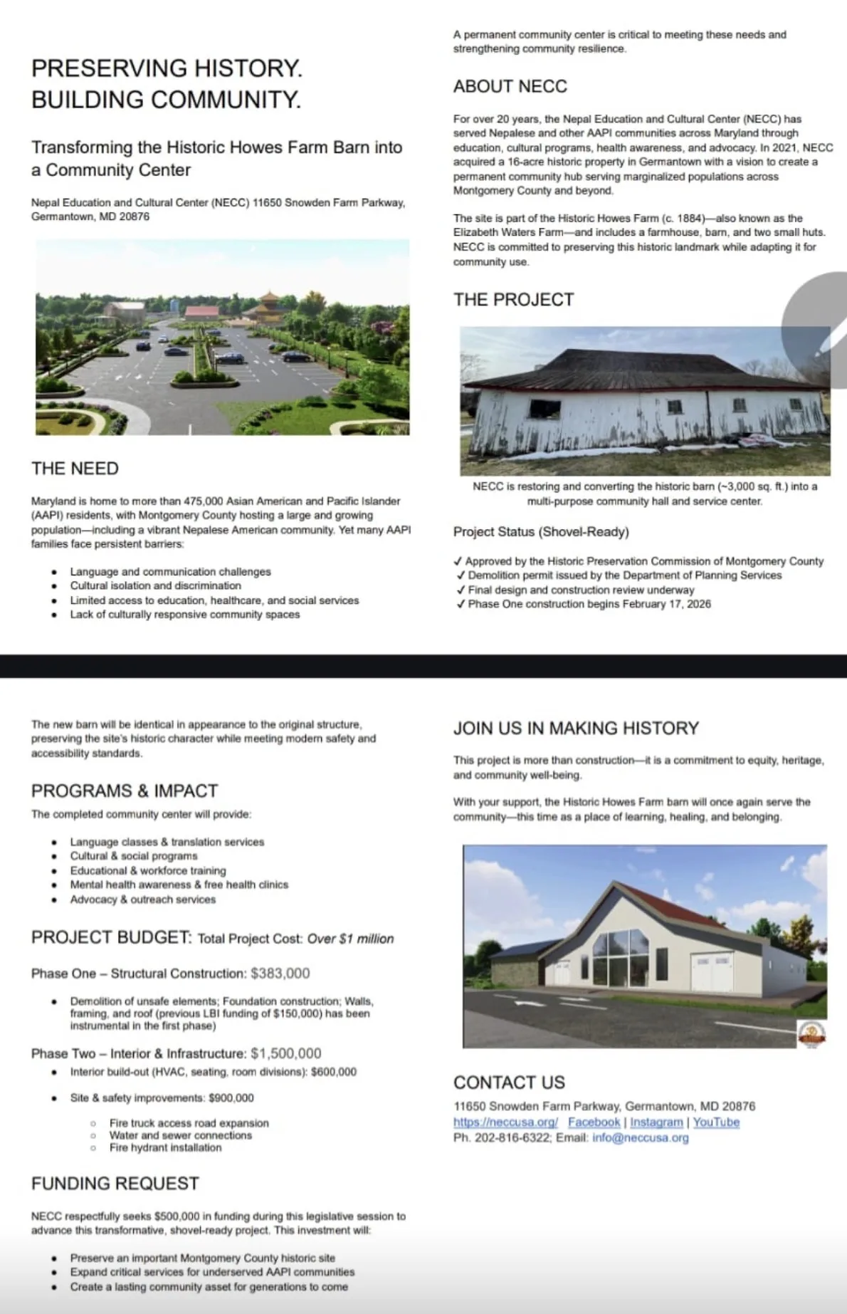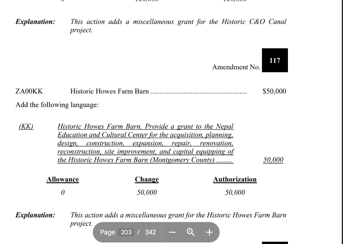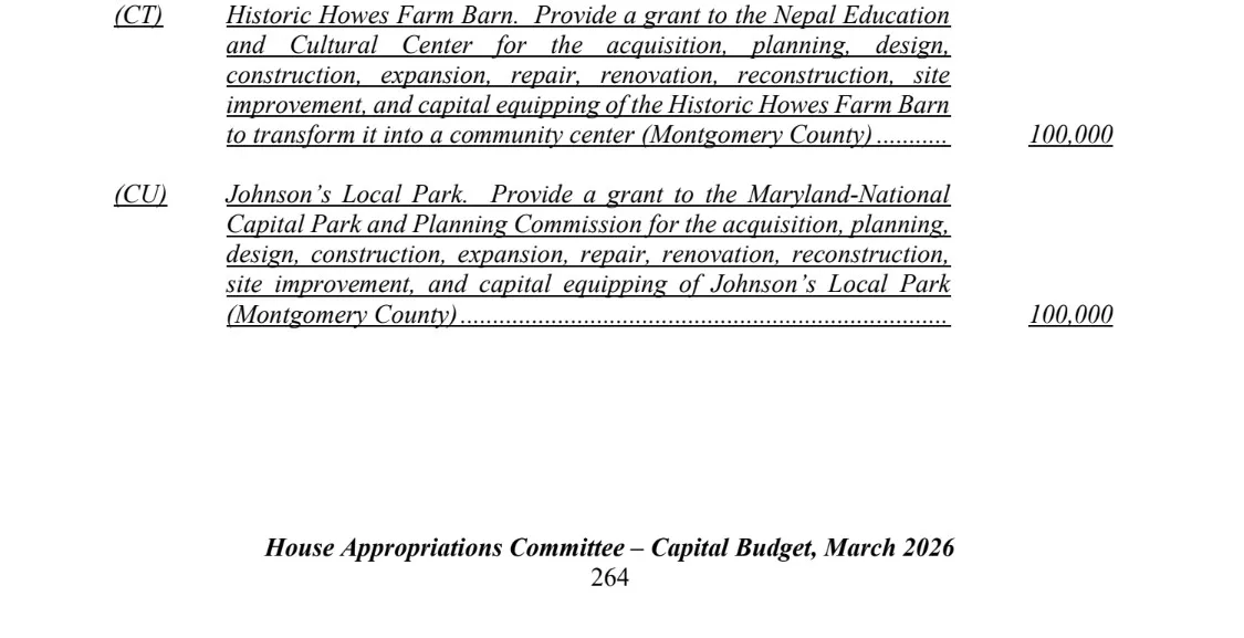 मेरिल्याड राज्य सांसद डिस्टिक ८ बाल्टिमोर काउन्ट्रिका प्रतिनिधि डा ह्यारी भण्डारीले यस पटक नेपाल एजुकेशन एण्ड कल्चर सेन्टर निमार्णका लागी मेरिल्याड राज्यबाट १ लाख ५० हजार डलर बिनियोजन गराउनु भएको छ । गत वर्ष पनि १ लाख ५० हजार डलर बिनियोजन भएकोमा गत वर्षको बजेट बाट धमाधम कल्चर सेन्टर निमार्णको काम भैरहेको डा भण्डारीले बताउनु भयो । House Appropriations Committee बाट बजेट पास भएर बजेट पुस्तिकामा प्रकाशन समेत भएको छ ।