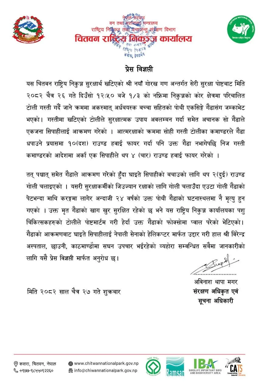 नेपाल आर्मीले आत्म रक्षाका लागी गोलि चलाउदा चितवन राष्ट्रिय निकुन्जमा १ वटा गैडाको मृत्यु भएको छ । चितवन राष्ट्रिय निकुञ्ज संरक्षण अधिकृत एवं सूचना अधिकारी अविनाश थापा मगरका अनुसार चैत्र २६ गते चितवन राष्ट्रिय निकुञ्ज सुरक्षार्थ खटिएको श्री नयाँ गोरख गण अन्तर्गत सेरी सुरक्षा पोष्टबाट दिउँसो नफ्रि निकुञ्जको कोर क्षेत्रमा परिचालित टोली गस्ती गर्दै जाने क्रममा अकस्मात् अर्धबयस्क बच्चा सहितको पोथी एकसिङ्गे गैंडाले एक सिपाहीलाई आक्रमण गरेको थियो । गस्तीमा खटिएको टोलीले सुरक्षात्मक उपाय अवलम्बन गर्दा समेत गैंडाले एकजना सिपाहीलाई आक्रमण गरेको र आत्मरक्षाको क्रममा सोही गस्ती टोलीका कमाण्डरले गैंडा धपाउने प्रयासमा दश राउण्ड हवाई फायर गर्दा पनि उक्त गैंडा नभागेपछि निज गस्ती कमाण्डरको आदेशमा अर्का एक सिपाहीले थप ४ चार राउण्ड हवाई फायर गर्दा समेत गैंडाले आक्रमण गरेको हुँदा घाइते सिपाहीको बचाउको लागि थप २ राउण्ड गोली चलाइएको र गोलि चलाउदा एउटा गोली गैंडाको पेटभन्दा माथि करङ्गमा लागेर अन्दाजी २४ वर्षको उक्त पोथी गैंडाको घटनास्थलमा नै मृत्यु हुन गएको प्रेस विज्ञप्ती मा उल्यख छ । उक्त मृत गैडाको खाग खुर सुरक्षित रहेको पनि सूचना अधिकारी अविनाश थापा मगरले प्रेस विज्ञप्ती मार्फत बताए । राष्ट्रिय निकुञ्ज कार्यालयका पशु चिकित्सकहरुको टोलीले पोष्टमार्टम गरी हेर्दा उक्त गैंडाको फोक्सोमा प्वाल परेको भेटिएको प्रेस विज्ञप्तीमा उल्यख छ । गैंडाको आक्रमणबाट घाइते सिपाहीलाई नेपाली सेनाको हेलिकप्टर मार्फत उद्दार गरी हाल श्री विरेन्द्र अस्पताल, छाउनी, काठमाण्डौमा सघन उपचार भईरहेको राष्ट्रिय निकुञ्ज कार्यालयले जनाएको छ ।