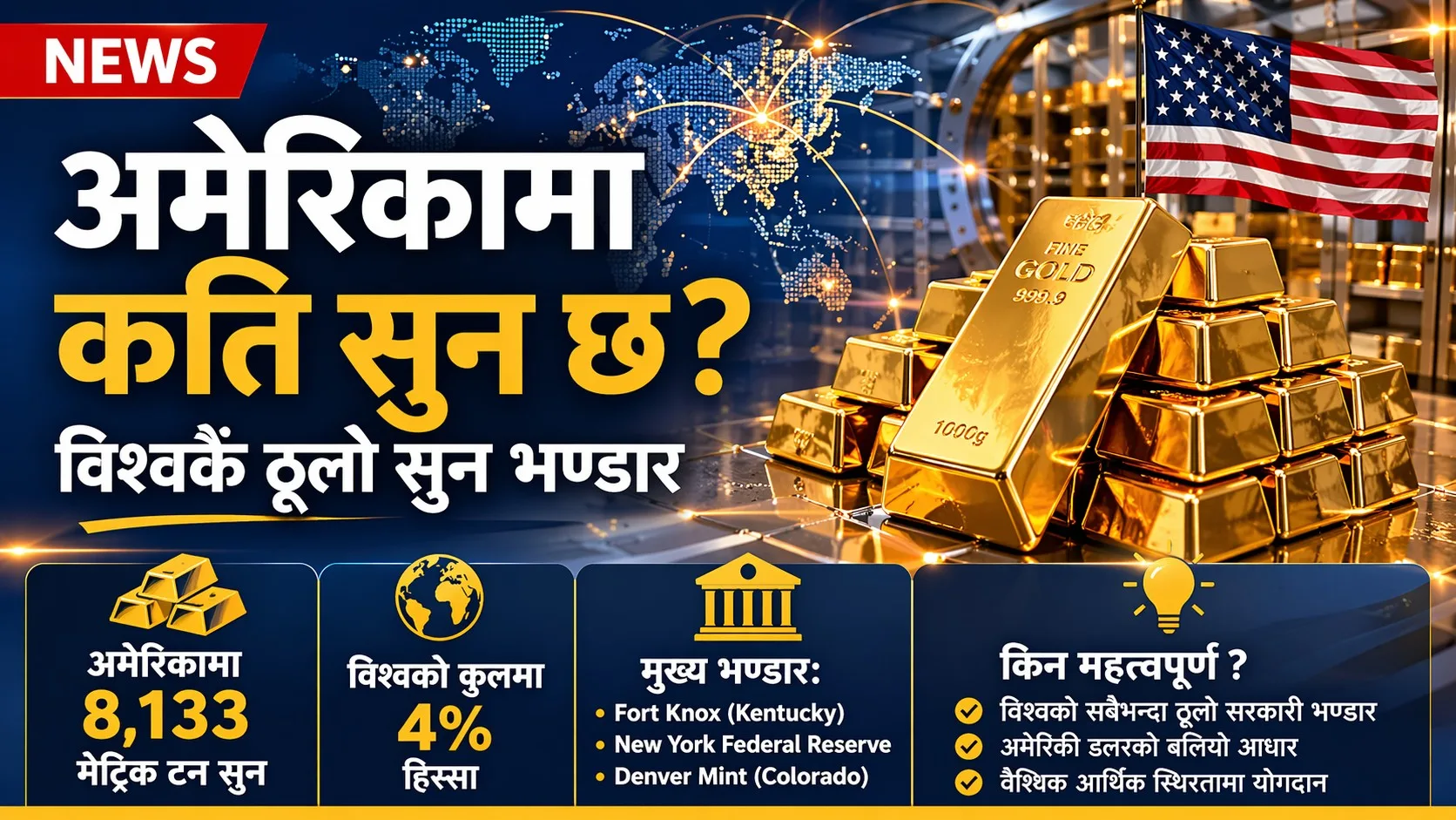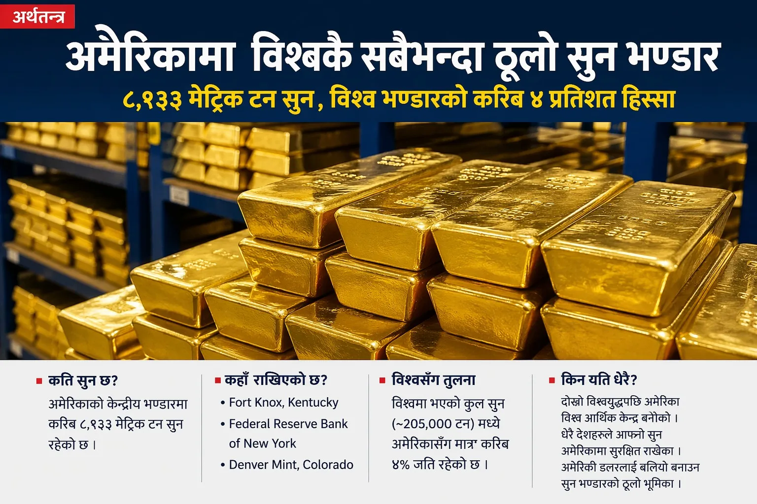 विश्व बजारमा आर्थिक अनिश्चितता, मुद्रास्फीति र भू–राजनीतिक तनावका कारण सुनलाई फेरि “सुरक्षित लगानी (Safe Haven Asset)” को रूपमा हेरिन थालिएको छ। आजको विश्वमा उपलब्ध तथ्याङ्क अनुसार हालसम्म खनिएको र प्रयोगमा रहेको सुनको कुल मात्रा करिब २,१६,००० देखि २,२०,००० मेट्रिक टन आसपास रहेको अनुमान गरिन्छ। यसमा गहना, केन्द्रीय बैंक, बुलियन र औद्योगिक प्रयोग सबै समावेश छन्। विश्व बजारमा अमेरिका विश्वकै सबैभन्दा ठूलो सुन भण्डार राख्ने देश हो। हाल अमेरिकी सरकारले करिब ८,१३३ मेट्रिक टन ९८ हजार टनभन्दा बढी सुन सुरक्षित राखेको छ। यो सुन मुख्यतः Fort Knox, West Point र अन्य सुरक्षित भण्डारण केन्द्रहरूमा राखिएको छ। विश्वका अन्य देशहरू जस्तै जर्मनी, इटाली, फ्रान्स र रुस पनि ठूलो मात्रामा सुन राख्छन्। तर अमेरिका अझै स्पष्ट रूपमा पहिलो स्थानमा छ।
