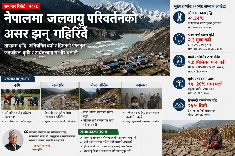 नेपालमा Climate Change को असर पछिल्ला वर्षहरूमा झन् तीव्र बन्दै गएको देखिएको छ। पछिल्ला अध्ययन र सरकारी निकायहरूको तथ्यांक अनुसार तापक्रम वृद्धि, अनियमित वर्षा र चरम मौसमीय घटनाले जनजीवनमा प्रत्यक्ष असर पारिरहेका छन्। Department of Hydrology and Meteorology Nepal अनुसार पछिल्ला दशकमा औसत तापक्रम निरन्तर बढ्दो क्रममा छ। विशेषगरी हिमाली र पहाडी क्षेत्रमा यसको प्रभाव बढी देखिएको छ। विज्ञहरूका अनुसार उच्च हिमाली क्षेत्रमा तापक्रम वृद्धि दर तराईभन्दा छिटो रहेको छ, जसले हिमनदी पग्लिने र हिमताल फुट्ने जोखिम बढाएको छ।