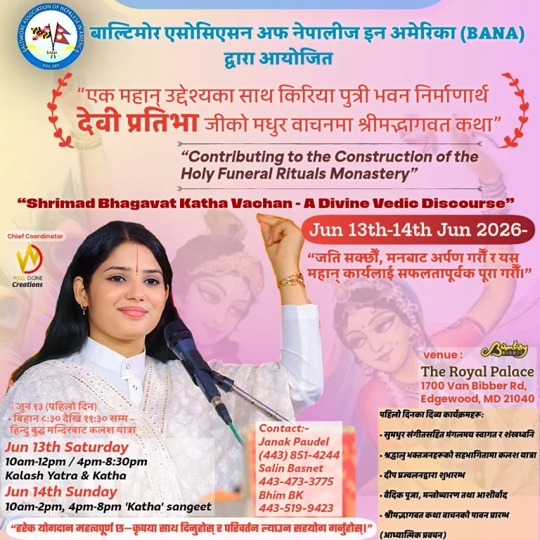 प्रकाश सिग्देल- वाल्टिमोर- पढ्न लाग्ने समय : १ मिनेट, प्रखर कथा वाचिका देवी प्रतिभाले अमेरिकाको मेरिल्याण्ड राज्य बाल्टिमोरमा श्रीमद्भागवत कथा वाचन गर्नु हुने भएको छ ।  मेरिल्याण्डमा नेपालीहरुको सामाजिक संस्था BANA (Baltimore Association of Nepalese